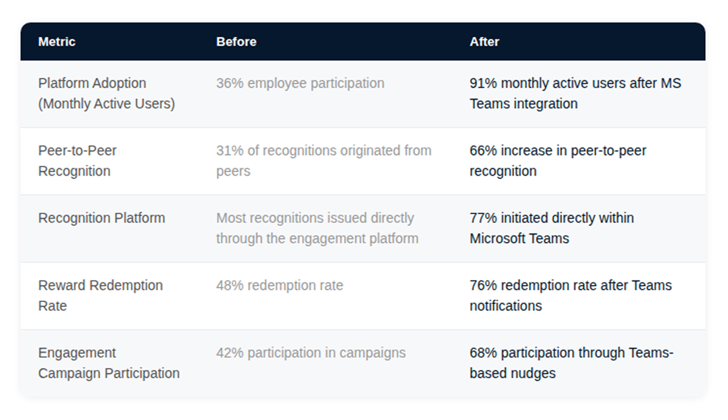 By embedding recognition and engagement programs directly within Teams, the organization significantly improved participation across its workforce.