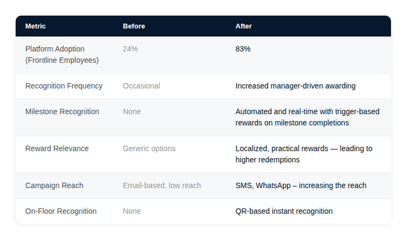 Within weeks, frontline participation increased significantly, recognition became more visible across operational teams, and engagement programs reached a much broader segment of the workforce.