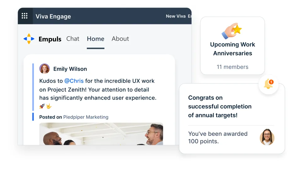 Embed Empuls capabilities such as recognition, rewards, and surveys into your intranets like Microsoft Viva to amplify engagement in the flow of work.