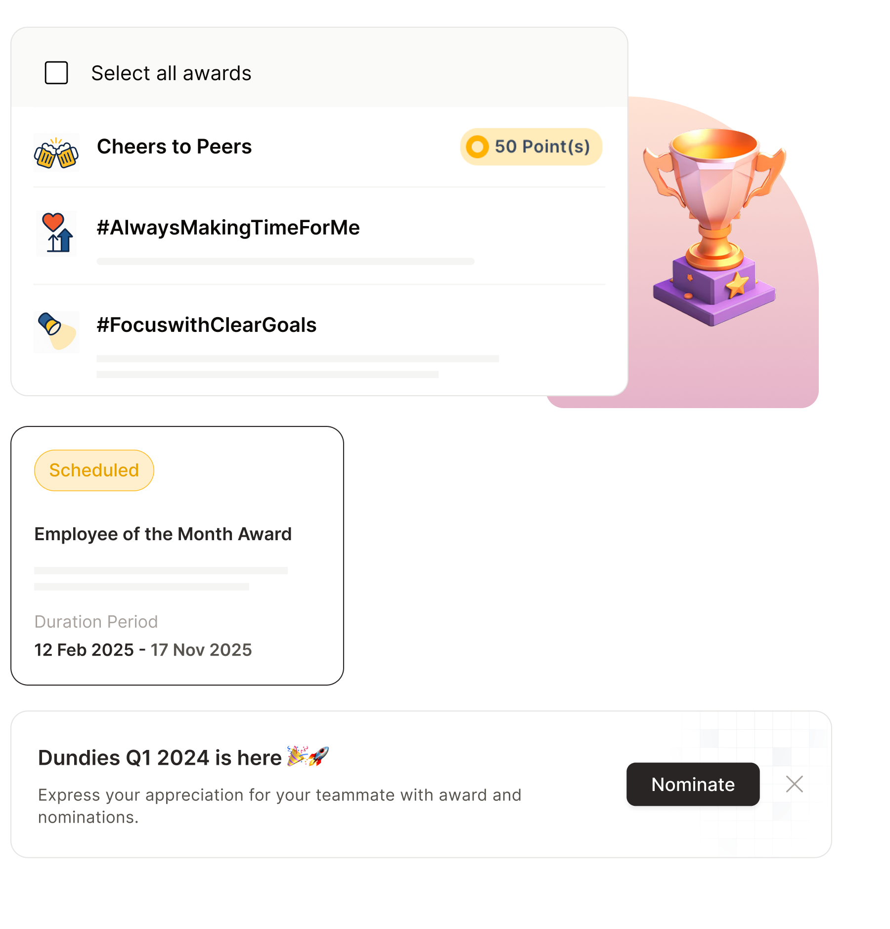 With complex and numerous employee recognition needs, having a single hub for all reward cycles makes reward program administration easy. You can configure all your rewards and automate them as per your needs.