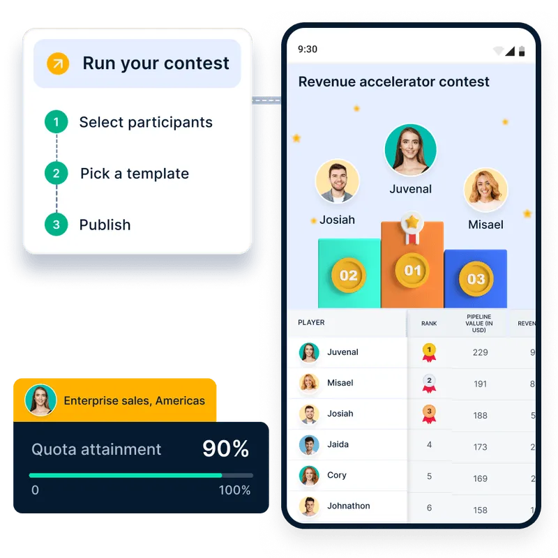 Choose from various tools in our solution, including AI-powered nudges, leaderboards, a rewards catalogue, and more to keep your reps motivated and engaged.