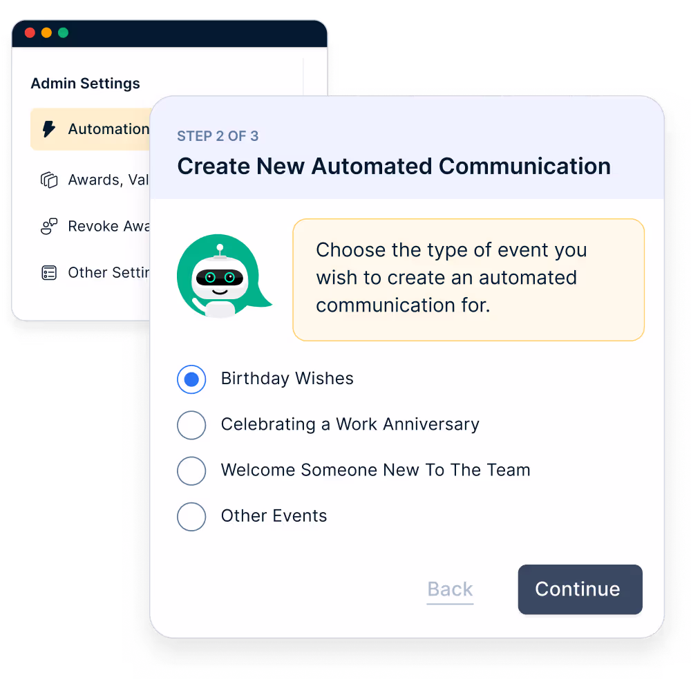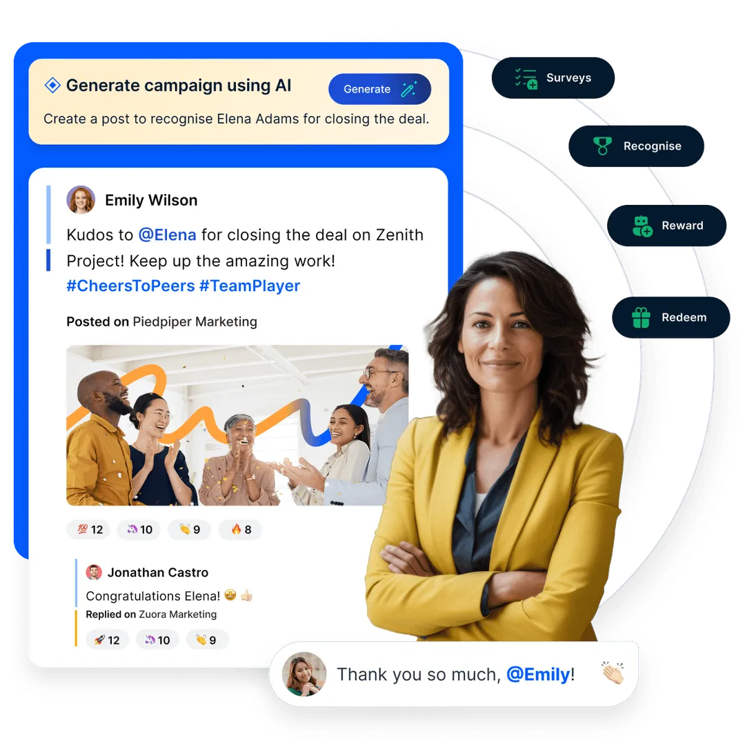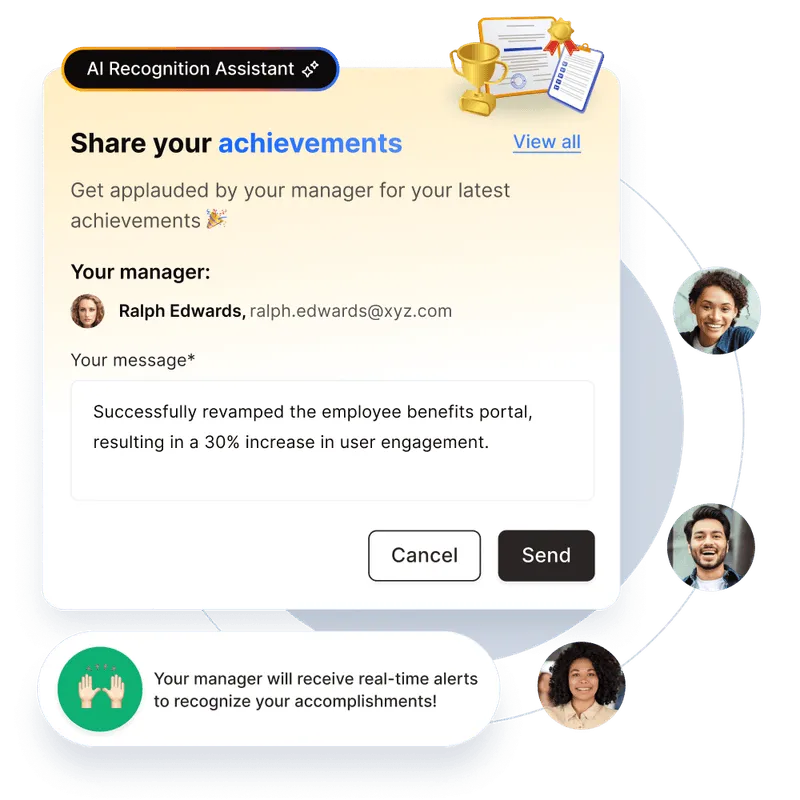 Streamline your recognition efforts with Em’s automated award creation feature. Say goodbye to manual design and content creation—simply enter a prompt, and Em generates personalized award graphics, compelling subject lines, and thoughtful award details instantly. This hassle-free process saves time while ensuring every award feels unique and impactful, enhancing the overall recognition experience.