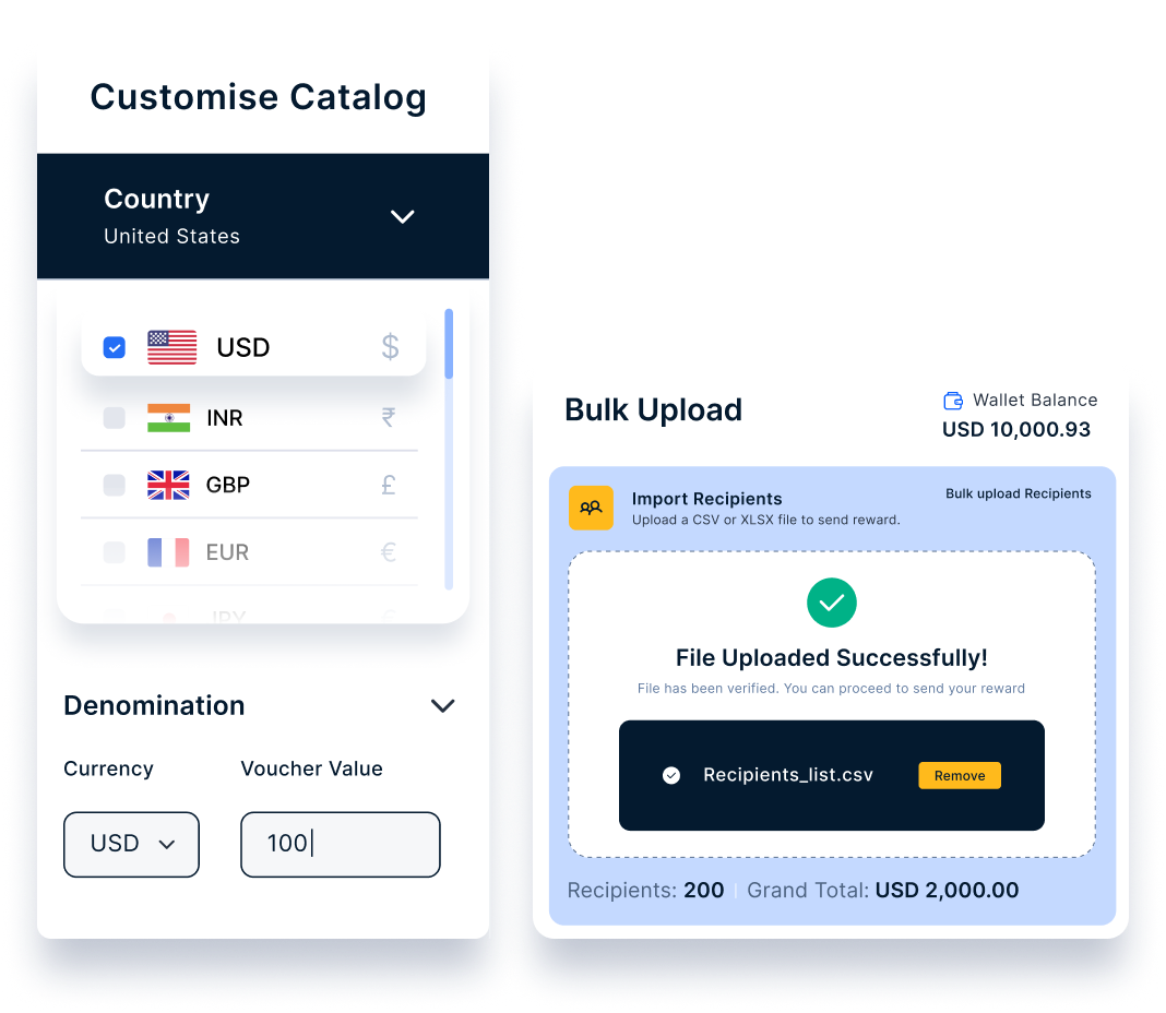 Need to send prepaid cards to a large group of recipients? No problem. With Xoxoday, you can issue virtual prepaid cards to up to 10,000 recipients simultaneously, all with just a few clicks.