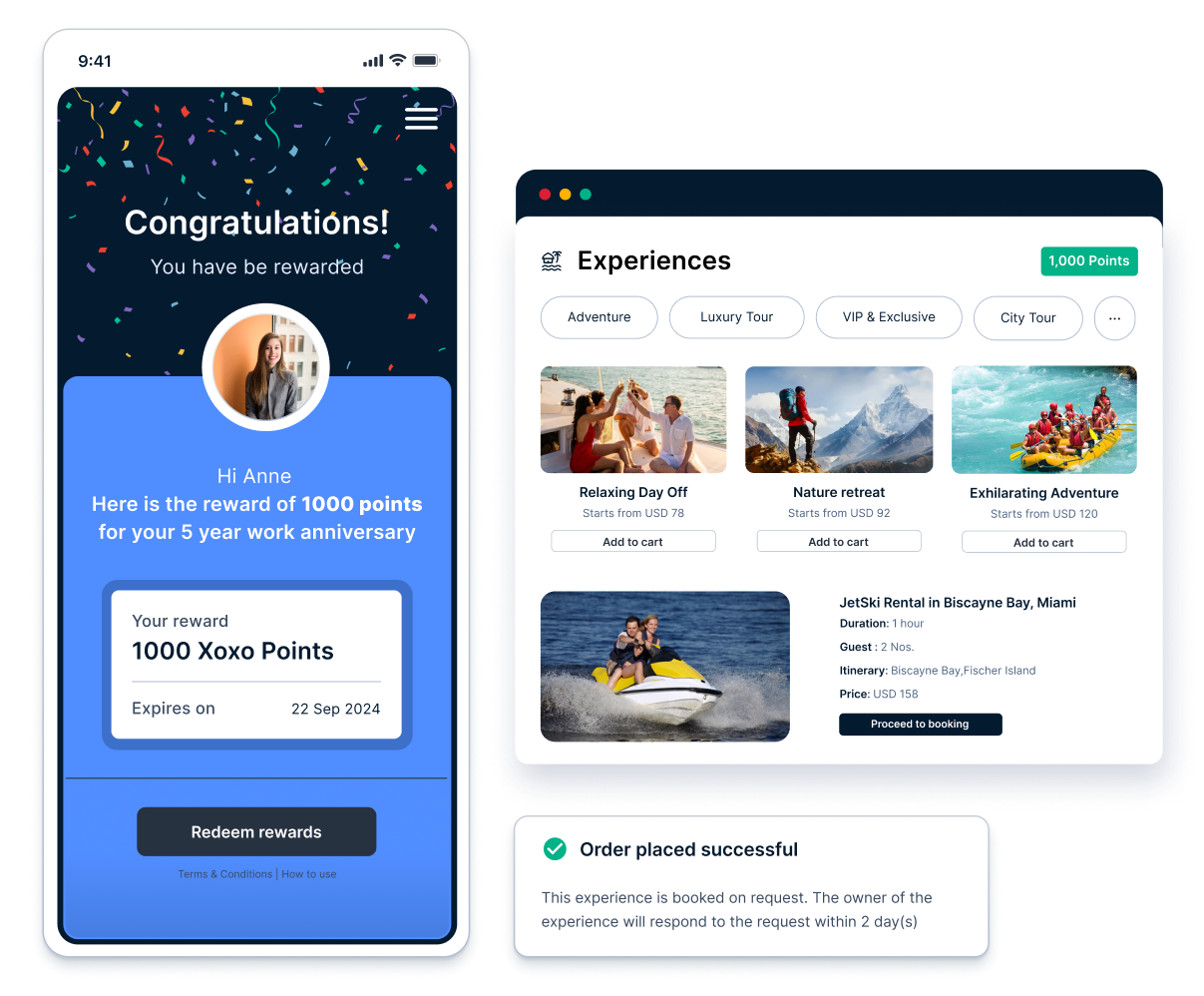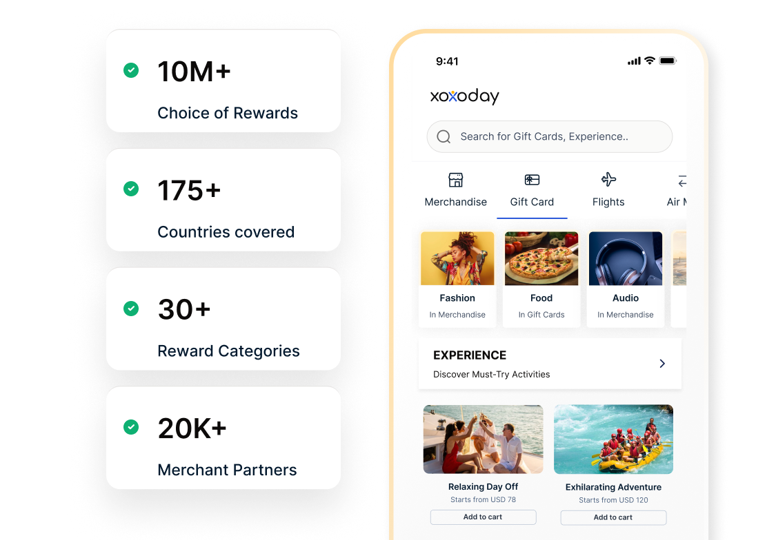 Elevate your users' rewarding journey with an exclusive in-app experience tailored to their preferences, empowering them to redeem from over 10M+ exciting options across gift cards, experiences, merchandise, travel, dining, and more.