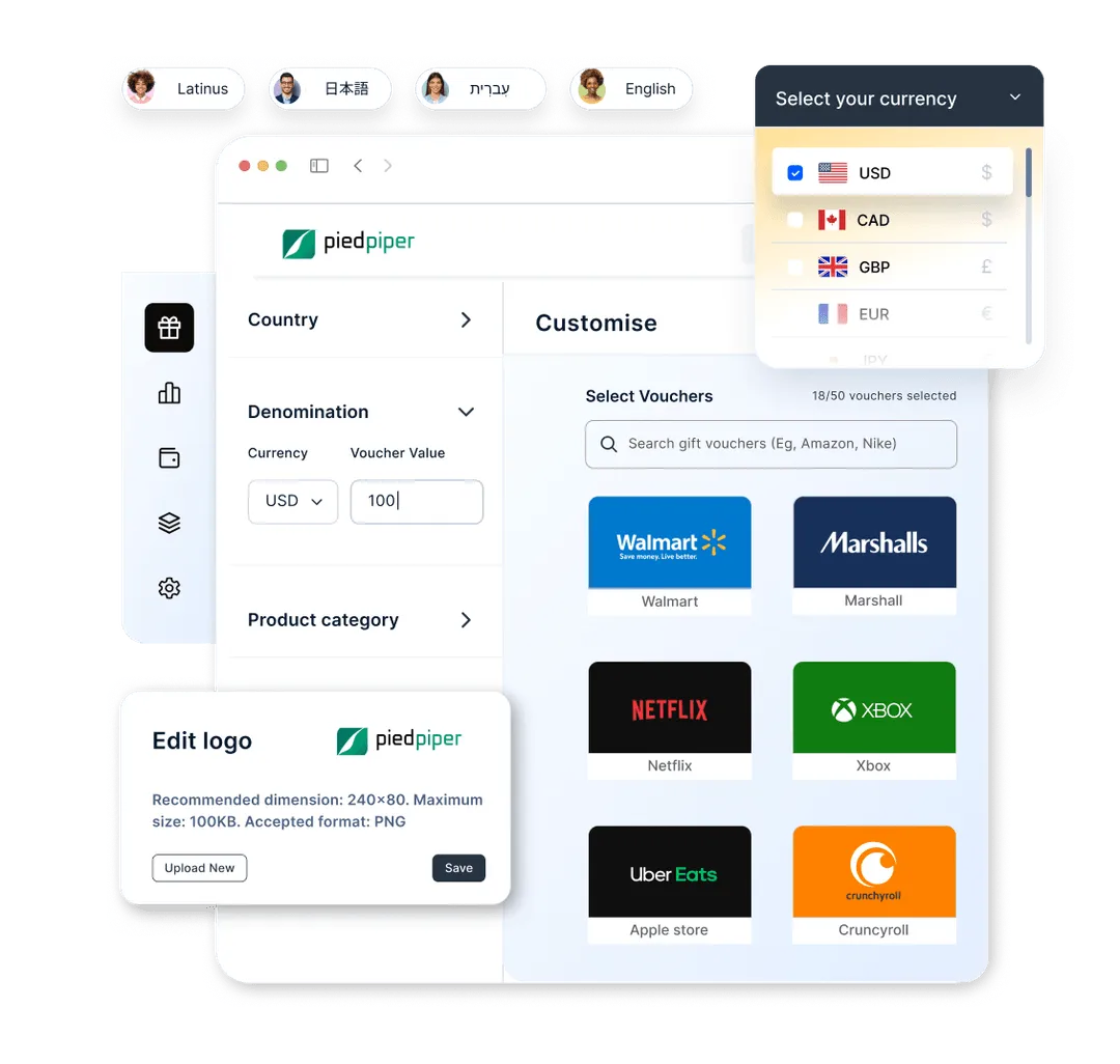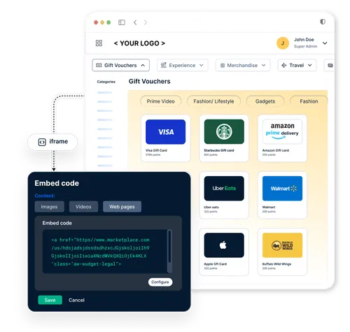 Customize the rewards marketplace with your logo and brand aesthetics, and curate the product catalog to give a personalized and delightful redemption experience for end-users.
