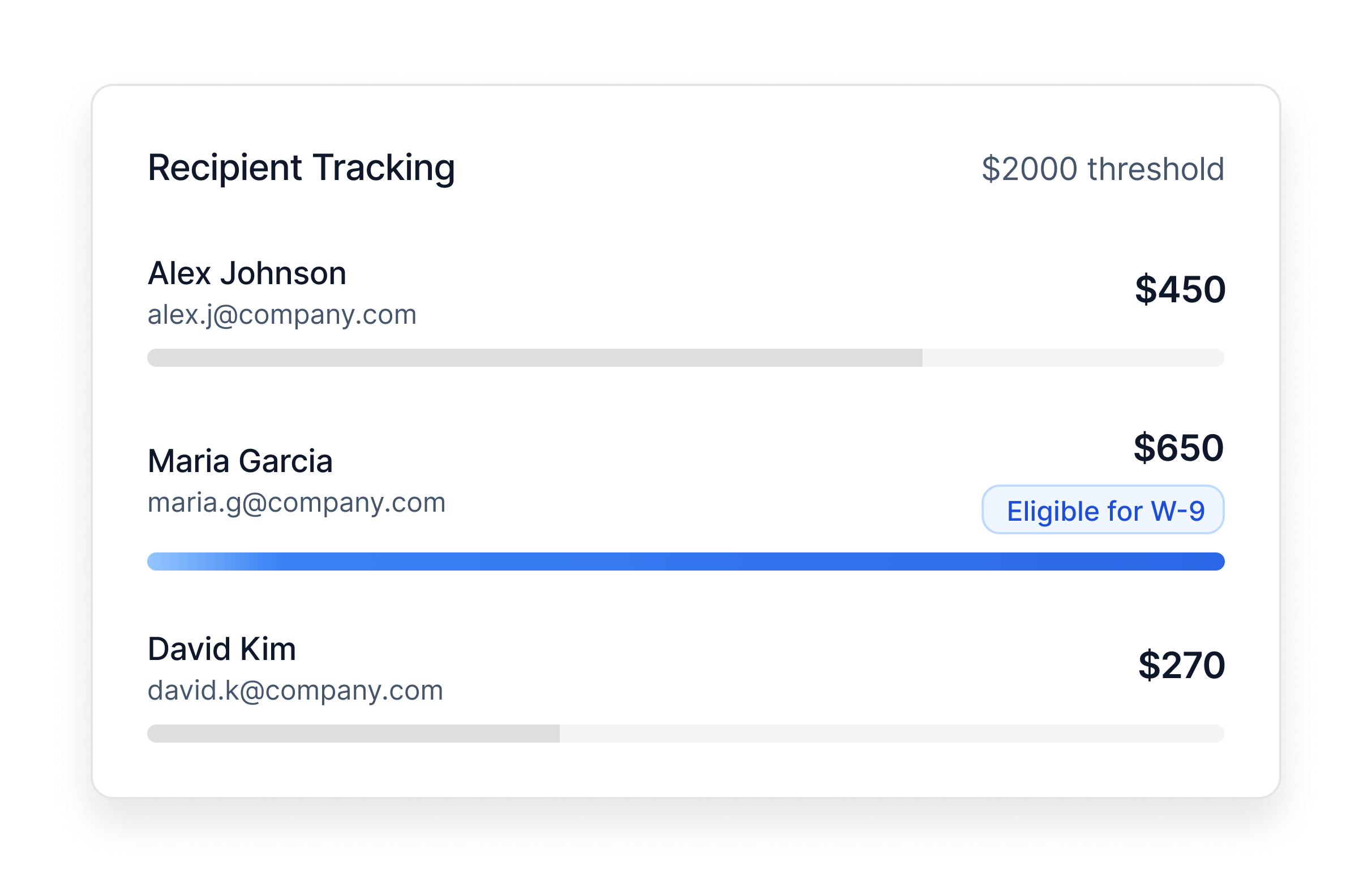 Monitor recipient progress toward IRS thresholds with automatic tracking.