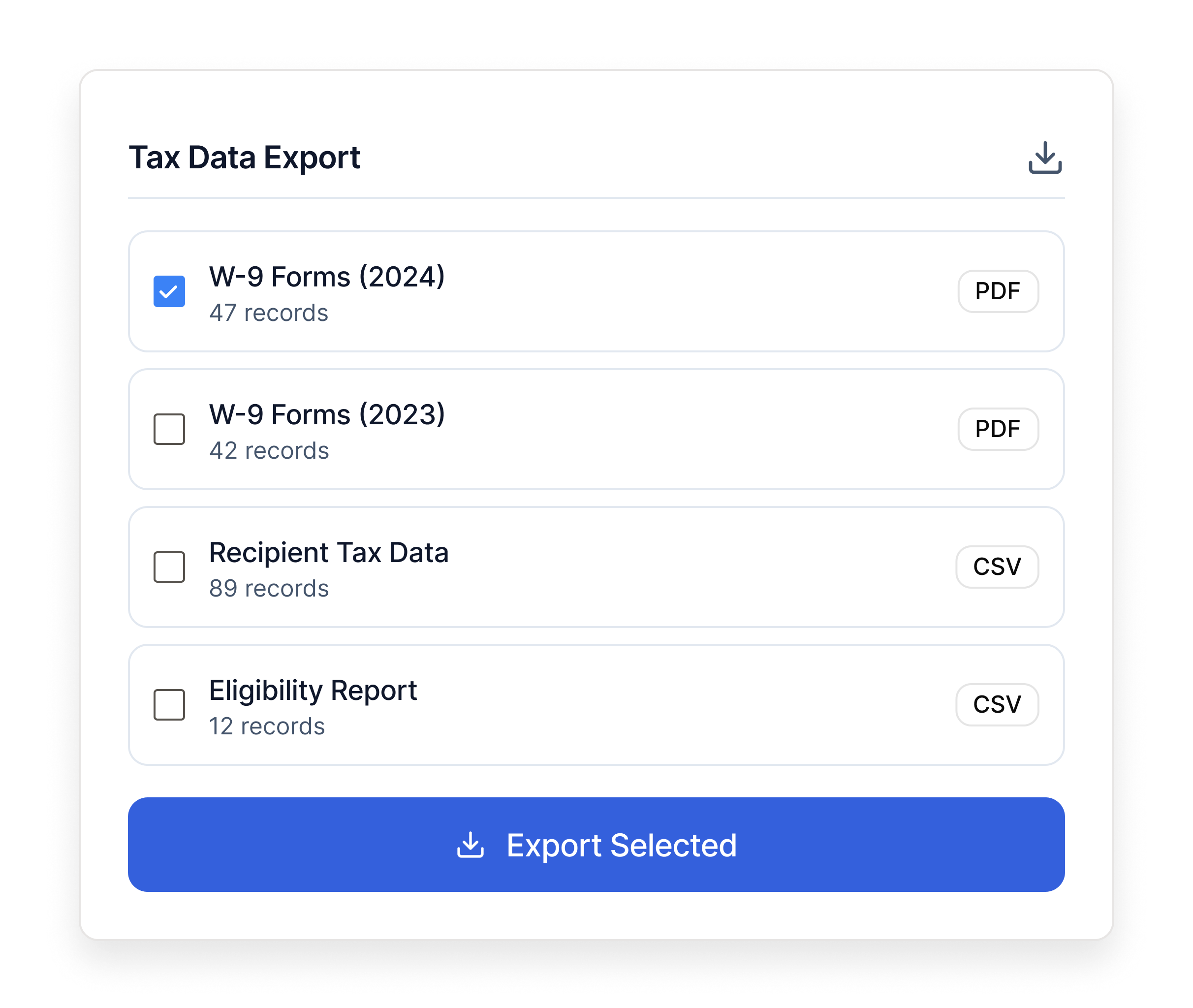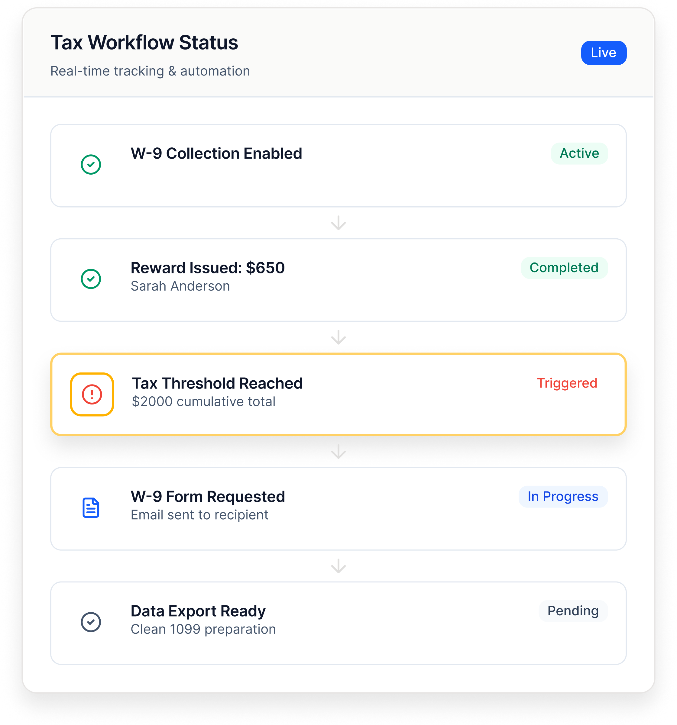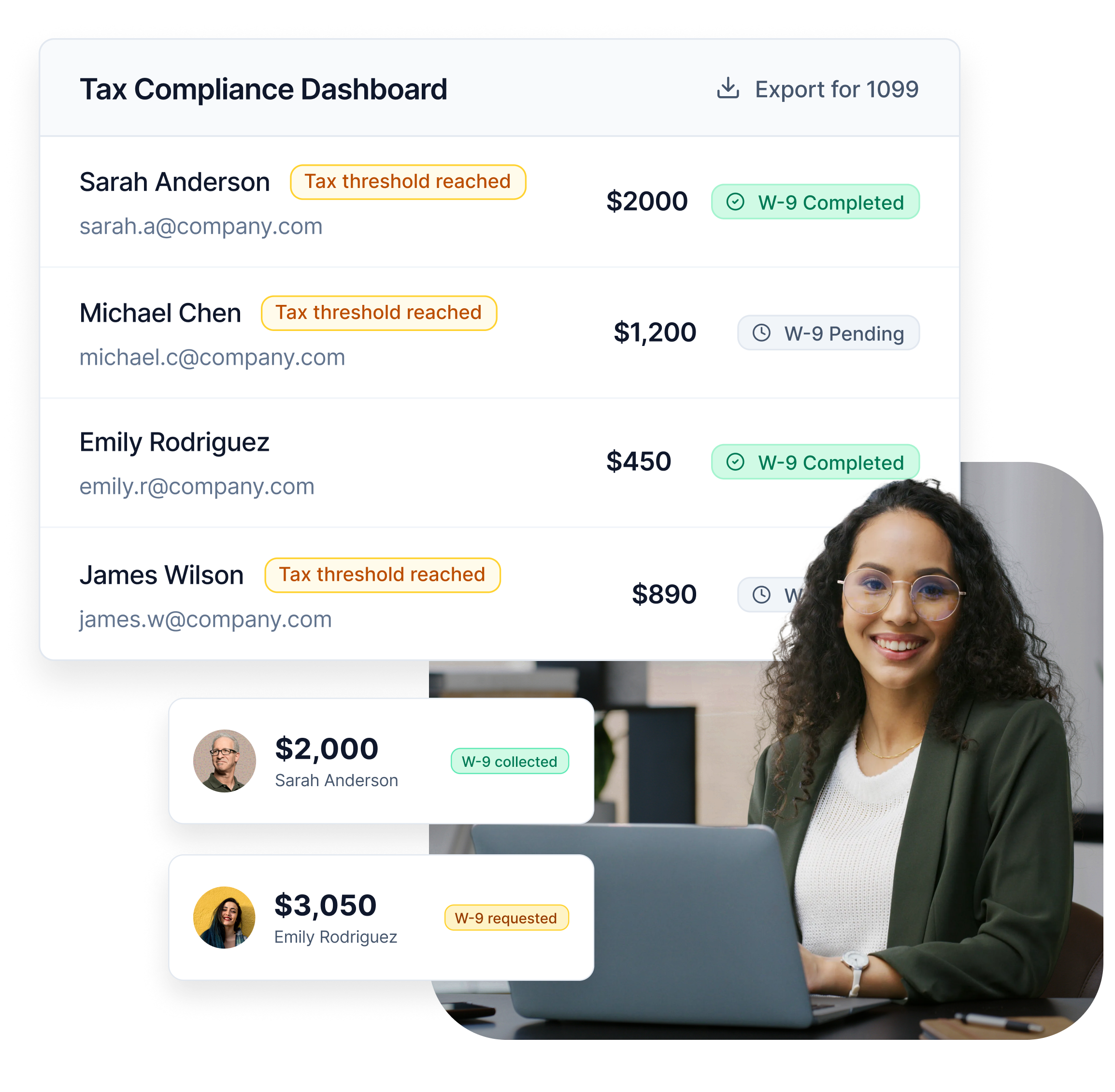 Collect tax details at the right time. Track eligibility automatically. Export clean data for 1099 preparation.