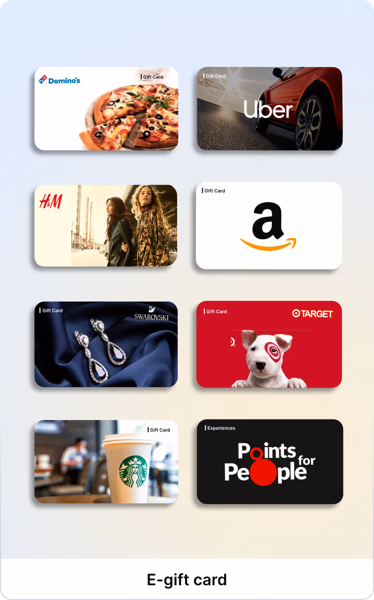 175+ countries, 30+ categories, including gift cards, experiences, prepaid cards, merchandise, travel, wellness, charity, swags, air miles, and more.